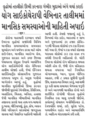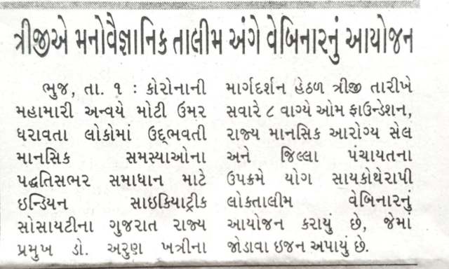 President of Indian Psychiatric Society-Gujarat State Branch Dr Arun Khatri has provided lecture in the Yoga Psychotherapy Mass Education Webinar Training news published in the Sandesh Newspaper 7July,2020.