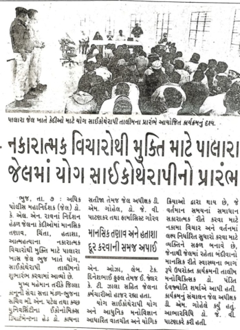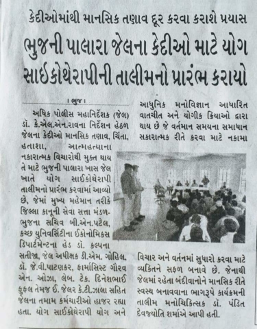 Regular weekly Yoga Psychotherapy sessions have been started for the prisoners of Palara Special Prision Bhuj in the presence of District Legal Service Authority Judge Shri B N Patel, Jail Supretendent Shri D M Gohil , HOD of Economic department of Kutch University Dr Kalpana Satija and Jail Doctor Dr. J V Patenkar and Jailer K T Jhala at Palara Special Prison.