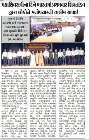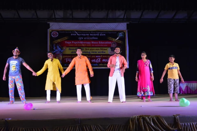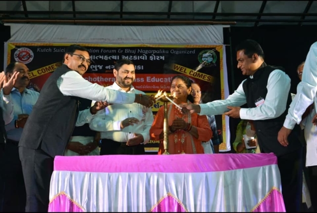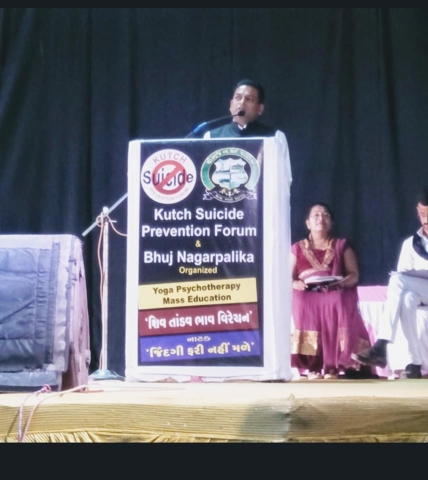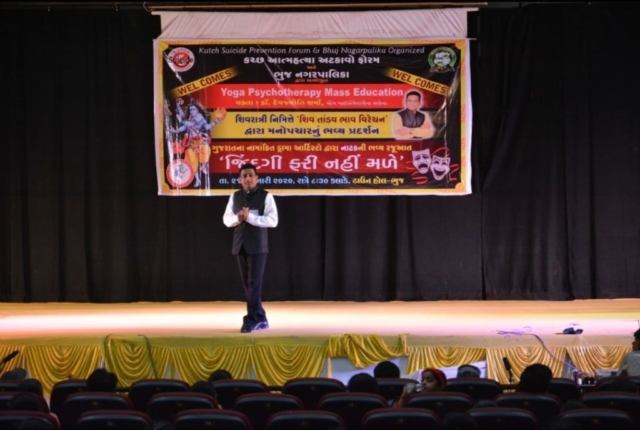 Yoga Psychotherapy Mass Education with demonstration of Shiva Catharsis was successfully organised by Kutch Suicide Prevention Forum and Bhuj Municipality for educating people about Anxiety, Depression, Stress Management and Suicide Prevention.Bhuj M.L.A. Shrimati Nimaben Acharya, Ex. President Kaushalya ben J Madhaparya, Vice President of Bhuj Municipality Dr Ram bhai Garvi, Bhuj Municipality Karobari Chairman Bharat bhai Rana, Navin Bhai Vayas all were present in this occasion (Occasion date : 21/Feb/2020).