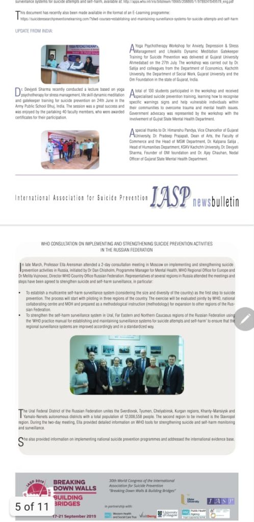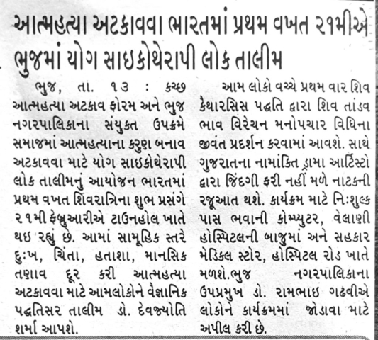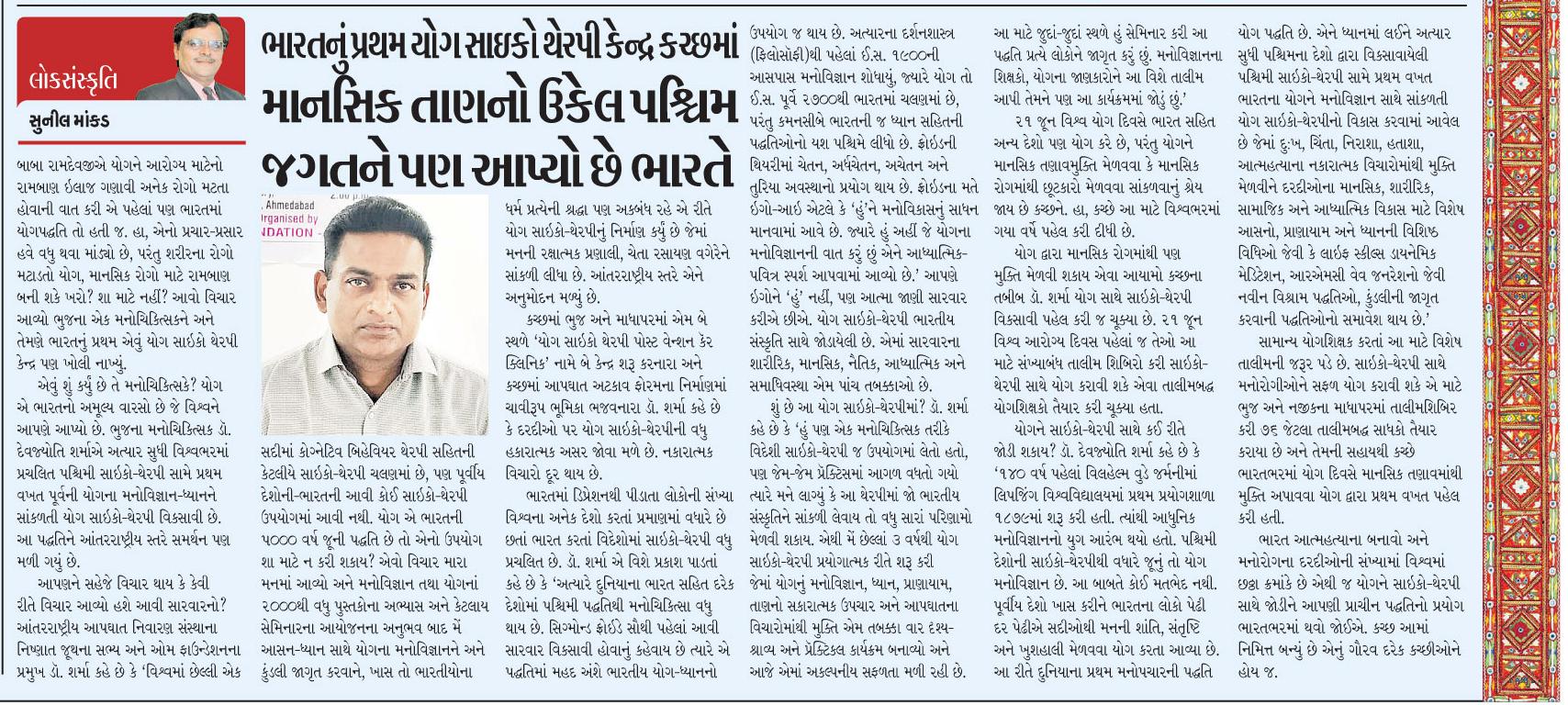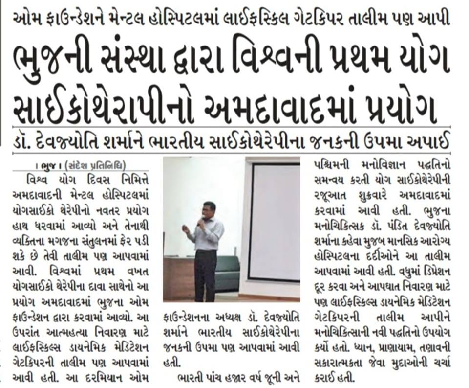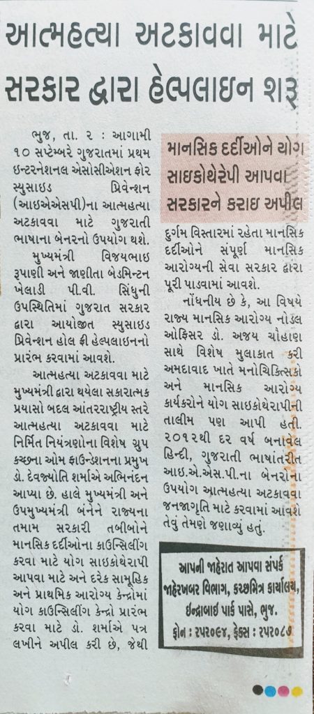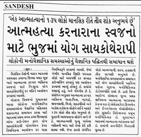 03-12-2018 :News flashed in media that YOGA PSYCHOTHERAPY has been developed by Psychiatrist Dr Pandit Devjyoti Sharma, Which is first Indian psychotherapy. Recently YOGA PSYCHOTHERAPY POSTVENTION CARE CLINIC has been started in the Bhuj city to support survivors of suicide loss. Friends and family of those who have died by suicide can join YOGA PSYCHOTHERAPY sessions on regular basis free of cost .This Yoga Psychotherapy Postvention Care Clinic has been appreciated by the president of International Association of Suicide Prevention Dr Murad Khan and Emeritus Professor of Health Policy Research, University of Edinburgh Steve Platt .Gujarati Newspapers like Kutchmitra , Divyabhasker and Sanded has published news regarding this . President of International Association for Suicide Prevention(IASP is in official relationship with the World Health Organization) Dr Murad Khan and Emeritus Professor of University of Edinburgh has appreciated this.