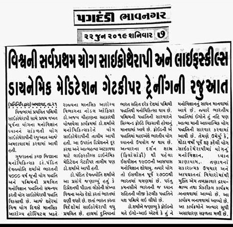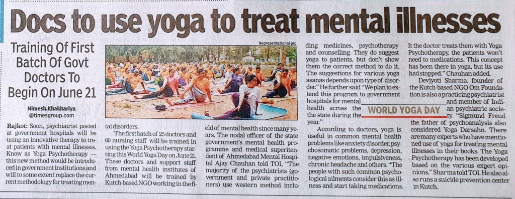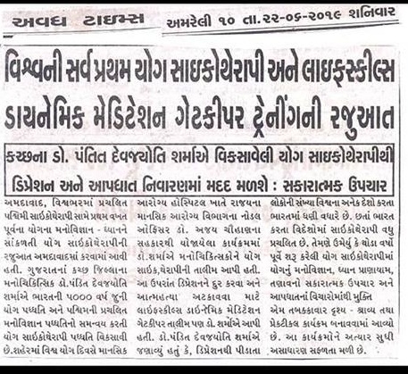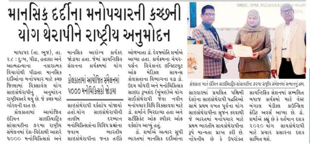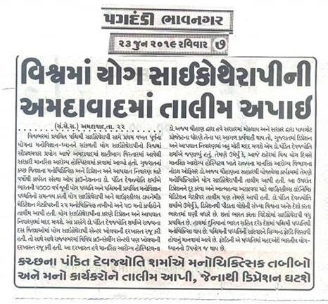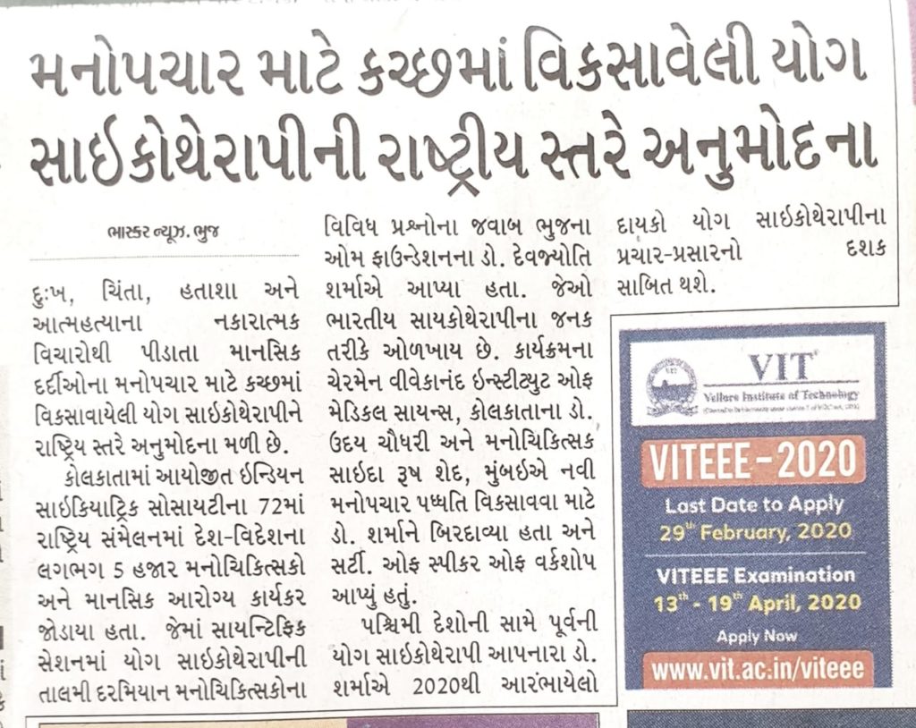 Leading news papers(Kutchmitra and Divya Bhaskar) mentioned Dr Pandit Devjyoti Sharma as a "Father of Indian Psychotherapy" for developing and delivering Yoga Psychotherapy in the workshop at 72th National Annual Conference of Indian Psychiatric Society in Kolkata 2020. Yoga Psychotherapy has gained national recognition .