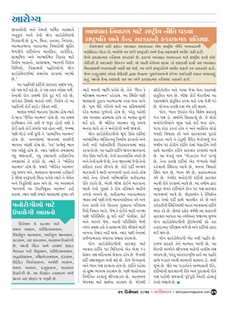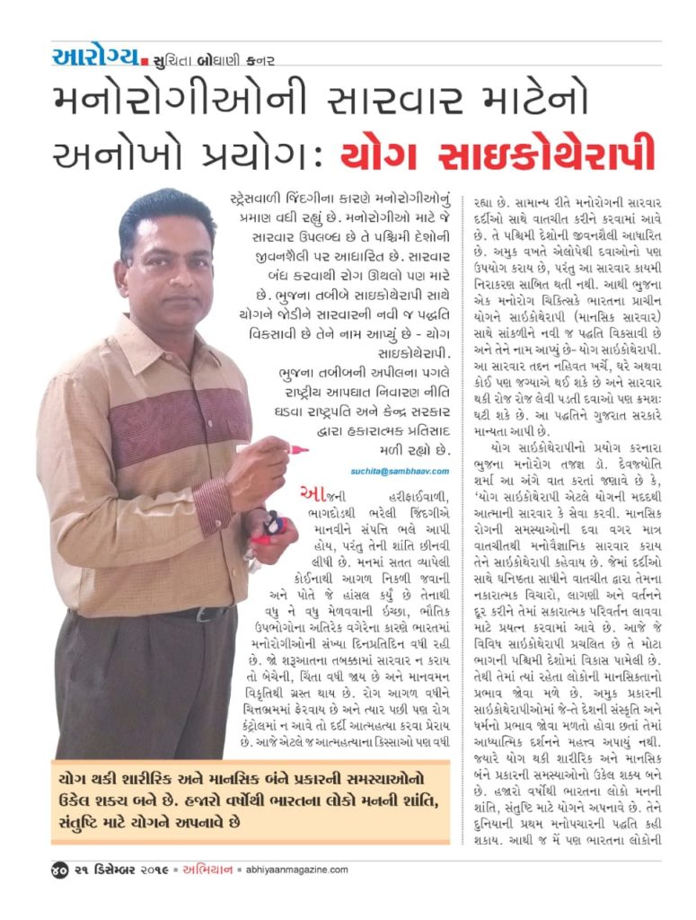 Abhiyaan Magazine : 21st December 2019 : Yoga Psychotherapy, an innovative approach for treating mental illness has been developed by Dr.Pandit Devjyoti Sharma.