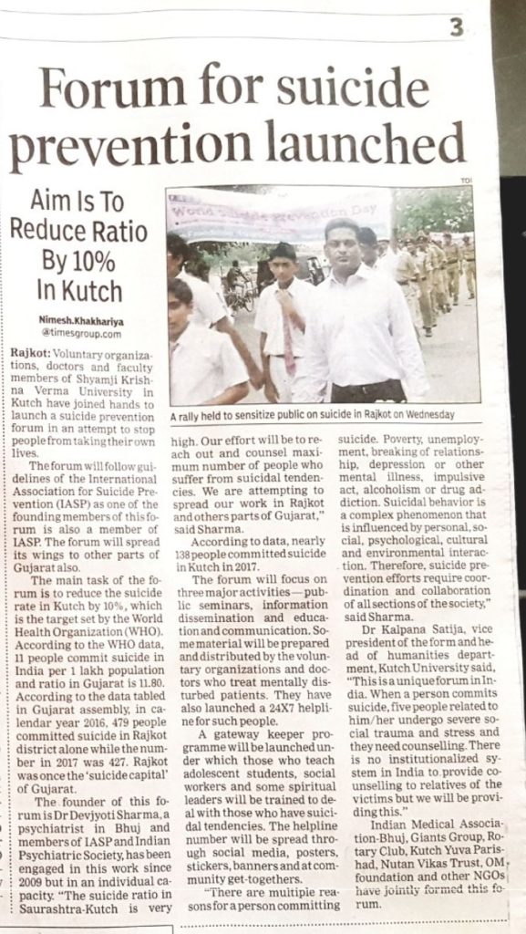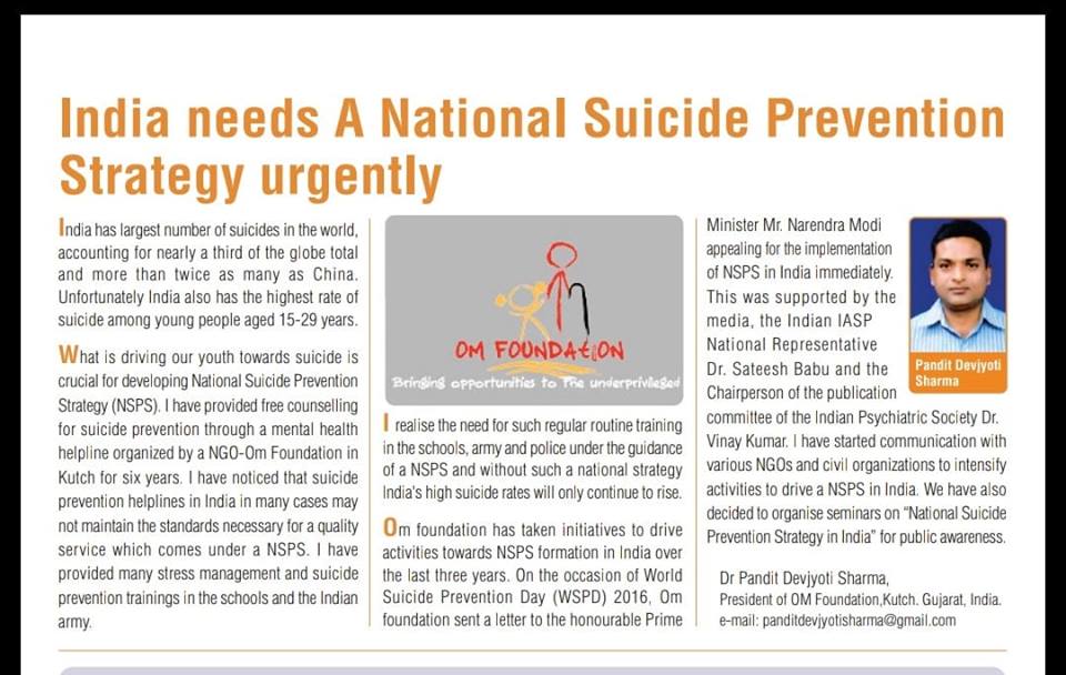05-Jan-2019 :National Suicide Prevention Strategy for India has been demanded by Dr Pandit Devjyoti Sharma ( An article published by International Association For Suicide Prevention News Bulletin ).