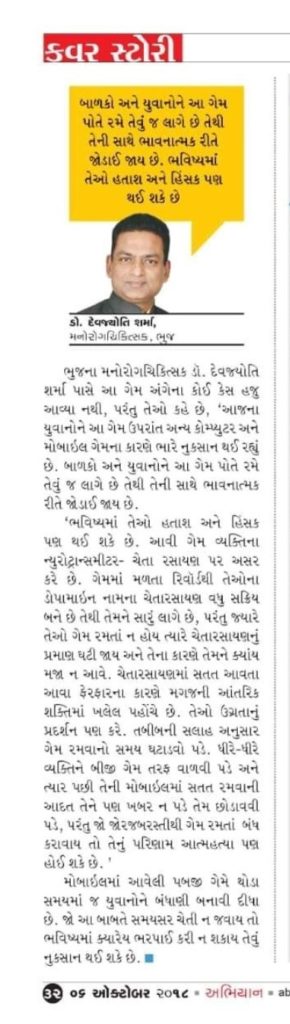 Article in Abhiyan Magazine regarding effects of PUBG game on Kids.