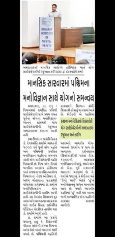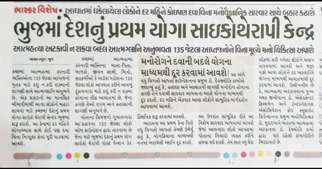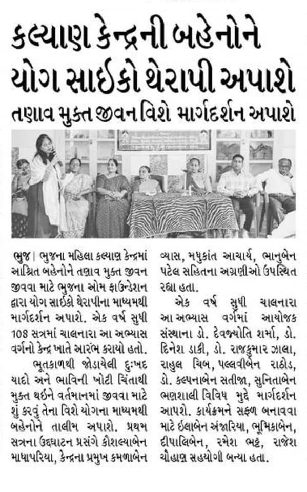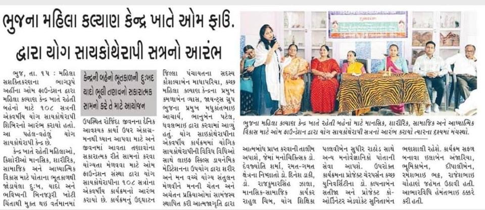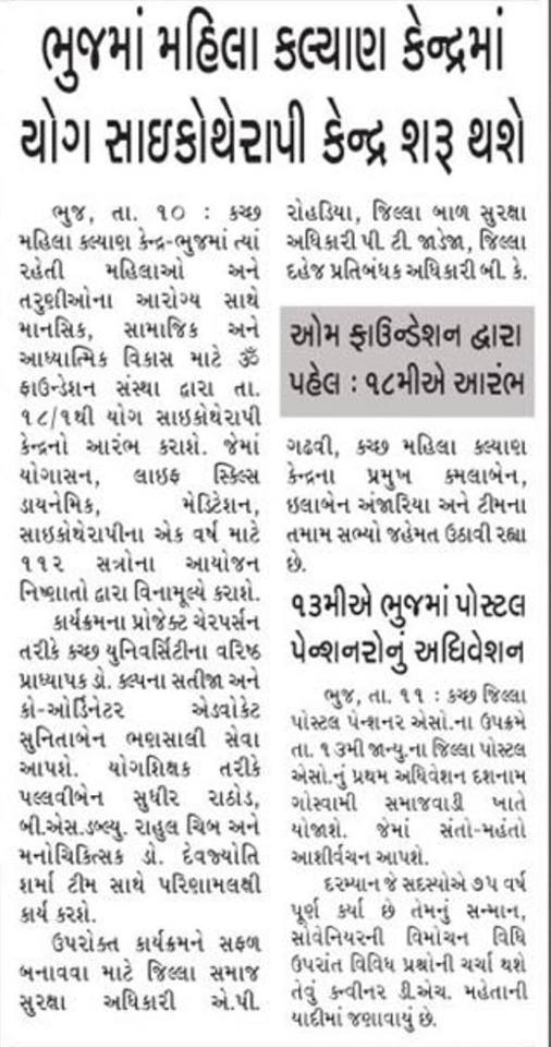 12-Jan-2019 : Yoga Psychotherapy Center for Women Empowerment is going to start fir homeless women on 18/1/2019 in Goverment Kutch Women Welfare Center (Shri Kutch Mahila Kalyan Kender) in Bhuj.This news published in leading gujarati news paper Kutchmitra.