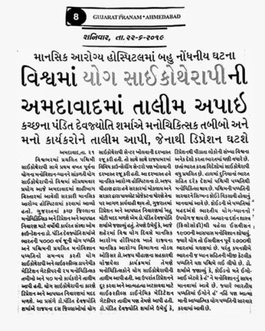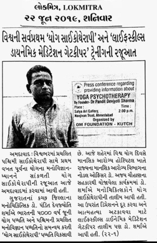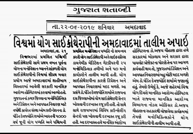 22-June-2019 Dr. PANDIT DEVJYOTI SHARMA IS A FATHER OF INDIAN PSYCHOTHERAPY proclaimed by one of the journalist in the press conference in the Navjeevan Satya Gallery in Ahmedabad . News flashed in Sandesh Newspaper. Dr sharma has provided world's first indian psychotherapy training Yoga Psychotherapy to the psychiatrists and mental health staffs/MSWs on the occasion of 5th World Yoga Day in the Ahmedabad Mental Health Hospital in the presence of State Mental Health Programme Nodal Officer Dr Ajay Chowan.